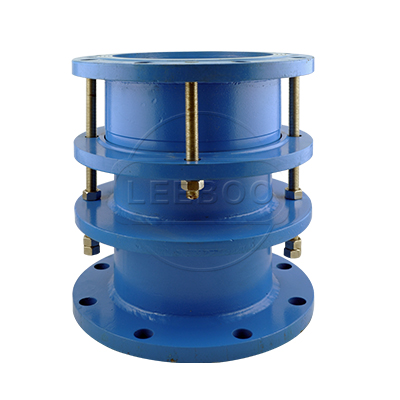 雙法蘭限位伸縮接頭是由本體、密封圈、壓蓋、伸縮短管等主要部件組成。在松套伸縮接頭原有性能的基礎(chǔ)上增設(shè)限位裝置,在大伸縮量處用雙螺母鎖定。管道在允許的伸縮量中可