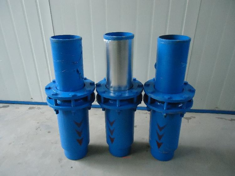 套筒式伸縮器,它由外筒和內筒組成,外筒和內筒的法蘭片上裝有限位桿,在外筒的內壁上設有限位塊,外筒和內筒之間由V型橡膠圈來密封。